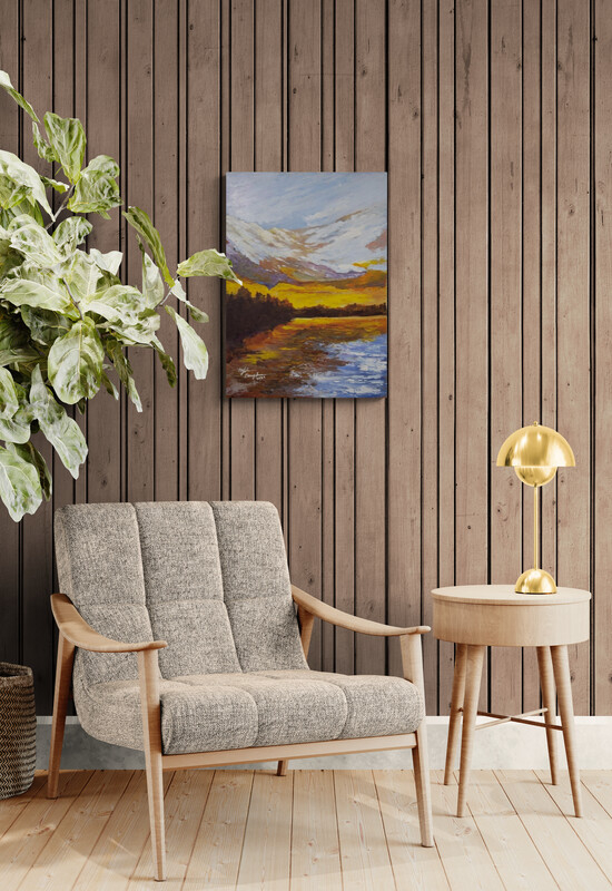 منظر جبلي مع بحيرة عند الغروب، منفّذ بضربات كثيفة وواثقة. تتوهّج الذهبيات والبُنيات عبر الوادي، فيما تذوب القمم المكسوّة بالثلج في سماءٍ باردةٍ شفافة، وتنعكس الألوان على سطح الماء أسفلها. يوازن العمل بين الرصد والمشاعر، ويدعو المتلقي إلى لحظةٍ يعيد فيها الضوء تشكيل الطبيعة.