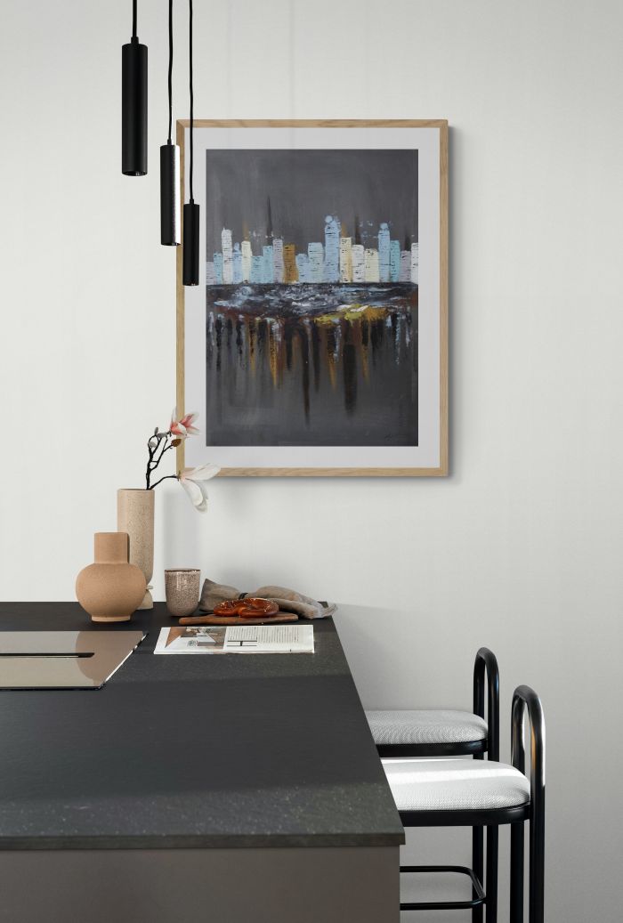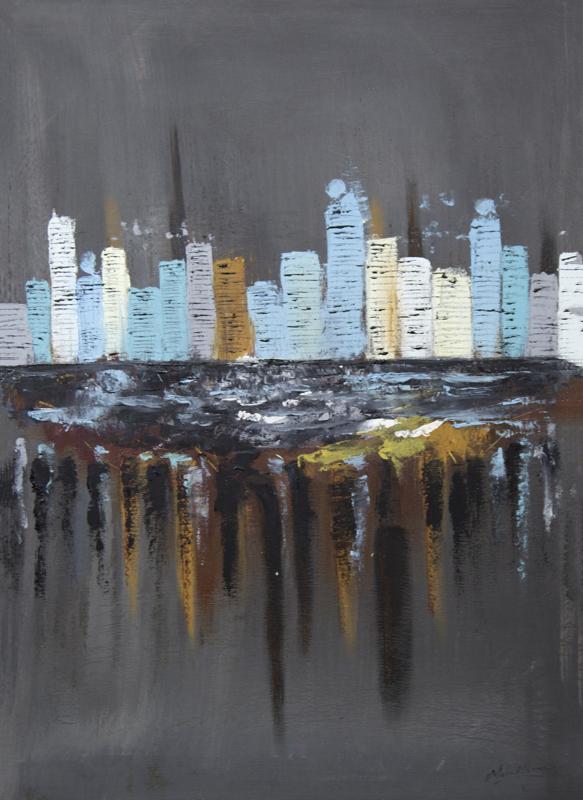 مدينة أبوظبي في مشهدٍ ليلي تتلألأ فيه الأبراج فوق مياه الخليج العربي العاكسة. تخلق الدرجات اللونية الهادئة من الرمادي الداكن والعنبر والأزرق الفاتح توازنًا بين البُعد والدفء — إيقاعًا من الضوء ينعكس في البحر أدناه. تمتد الانعكاسات العمودية كذكرياتٍ على السطح، موحيةً بالزمن والحركة والحوار بين الثبات والتغيّر. في هذا التكوين الجوي، يحوّل خريس أفق المدينة الحديثة إلى سمفونيةٍ حيةٍ من الضوء والصمت والبحر.