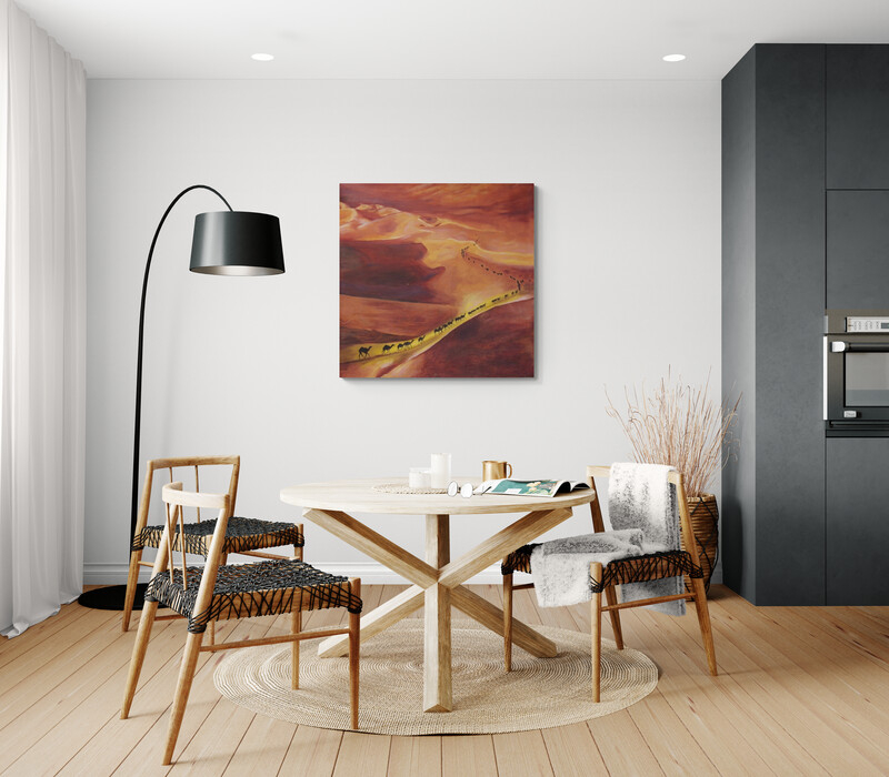 يرسم ماهر خريّص في هذه اللوحة البانورامية إيقاع القافلة الأبدي، حيث تسير الجمال في خطٍّ ذهبيٍّ متوهّج يخترق كثبان الصحراء المشتعلة بألوانها الترابية العميقة. تمتزج ظلال الأحمر والذهبي والبني المحروق لتشكّل فضاءً واسعاً ينبض بحرارة الشمس وصمت الرمال، في مشهدٍ يحاكي الخلود والانسياب.