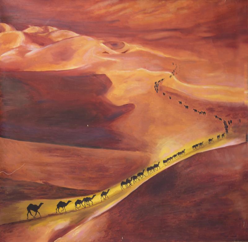 يمتدّ الخط الذهبي كرمزٍ للطريق والمصير، يقود القافلة في رحلةٍ أبديةٍ نحو الأفق. ومن خلال توازن اللون والضوء، يحوّل الفنان المشهد إلى قصيدةٍ تشكيلية عن الصبر والرحلة الإنسانية، وعن الصحراء بوصفها فضاءً للسكينة والتأمل والإيمان.