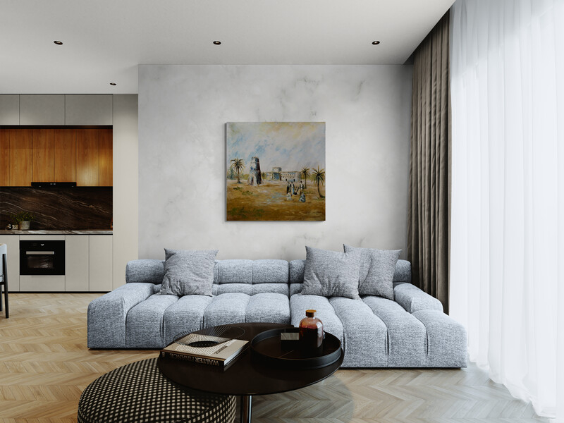 يستحضر ماهر في هذه اللوحة ملامح العمارة التراثية وروح المجتمع العربي القديم. في فضاءٍ صحراويٍّ مضيء، يرتفع حصنٌ قديمٌ كرمزٍ للحماية والانتماء، تحيط به مجموعةٌ من الرجال في جلسةٍ تذكّر بعادات التواصل والمجالس القديمة. بلمساته الانطباعية ودرجاته الدافئة من البني والذهبي، يمنح الفنان للمشهد طابعاً حيّاً يعيد للأذهان ملمس الرمل وصلابة الحجر ووهج الشمس.