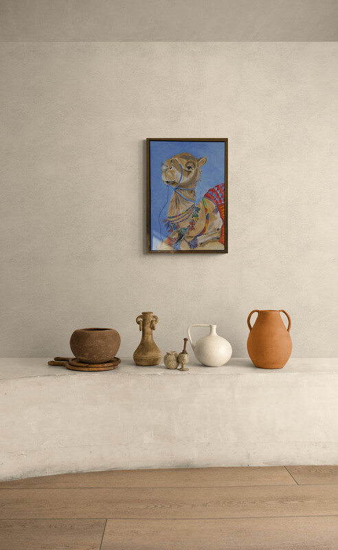 With gentle humor and affection, Maher Khreis portrays the camel — the beloved child of the desert — as both majestic and endearing. Painted in luminous tons of sand and sky, the creature’s soft expression and ornate adornments evoke joy, pride, and timeless familiarity. The artist’s brush translates cultural memory into color: every tassel, every gaze carries the warmth of Bedouin life and the poetry of vast horizons. Desert Baby is a celebration of innocence, endurance, and the unspoken bond between the desert and its faithful companion.