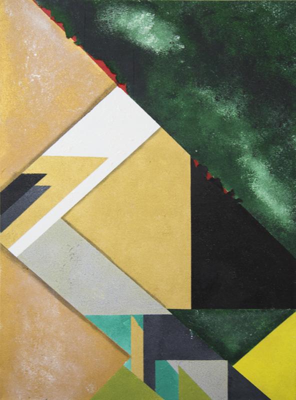 In this composition of intersecting planes and chromatic tension, an exploration of the geometry of balance and motion. Triangular forms in gold, white, and deep green create a rhythmic dialogue between shadow and illumination. The layered textures evoke both architectural solidity and atmospheric depth, transforming geometry into a meditative landscape. Through precision and harmony, reflection on how structure, light, and intuition coexist within the abstract order of space.