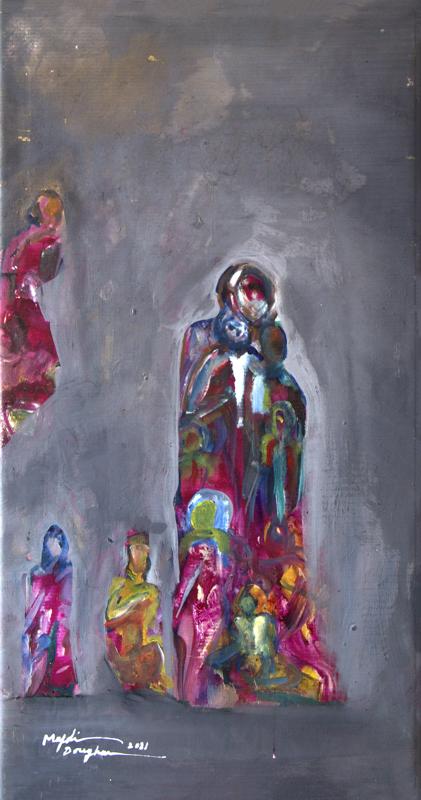 Majdi Al Tayeb’s composition emanates a sense of spiritual introspection, where color and form dissolve into an ethereal atmosphere. The figures, rendered in luminous reds, golds, and blues, seem to emerge from within the canvas — ghostlike yet full of presence. Through abstraction and layered transparency, the artist creates a symbolic meditation on community, memory, and faith. The central figure radiates compassion and protection, surrounded by smaller forms that evoke humanity’s shared search for light and connection within the vastness of existence.