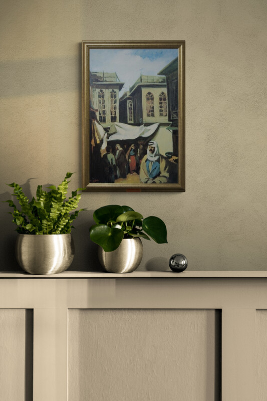 This evocative painting captures the spirit of the old Arab marketplace, where narrow alleys and traditional buildings form the backdrop to daily life. The artist employs soft, impressionistic brushwork and warm light to convey a nostalgic sense of time and place — a meeting between memory and architecture.