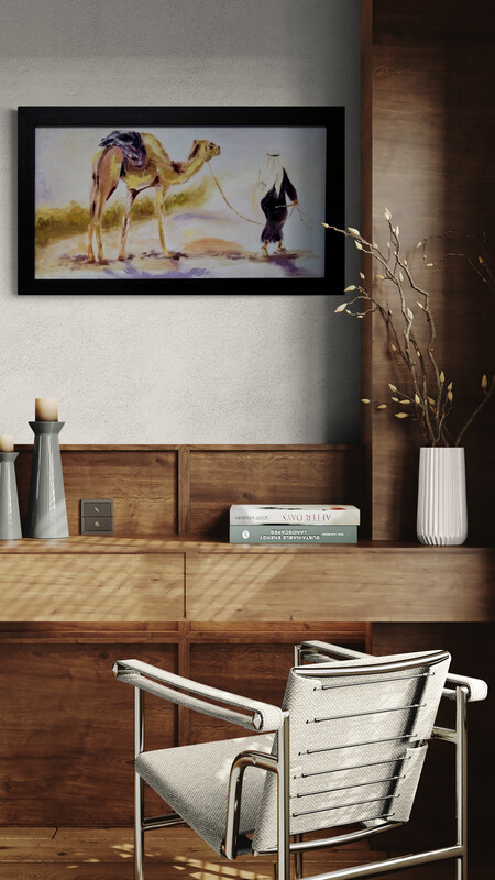 The robed figure leads the camel with quiet dignity, his presence gently dissolving into the golden horizon. Through a restrained yet expressive technique, the artist reflects on heritage, simplicity, and the rhythm of desert life — a meditation on movement, solitude, and belonging.
