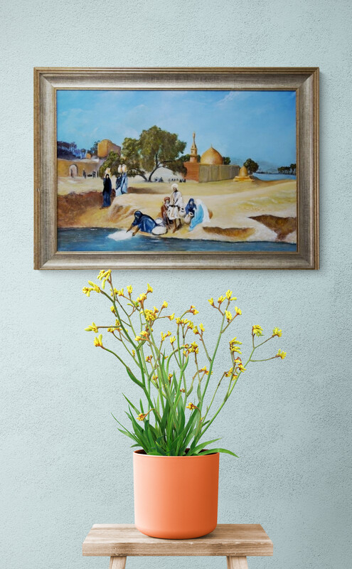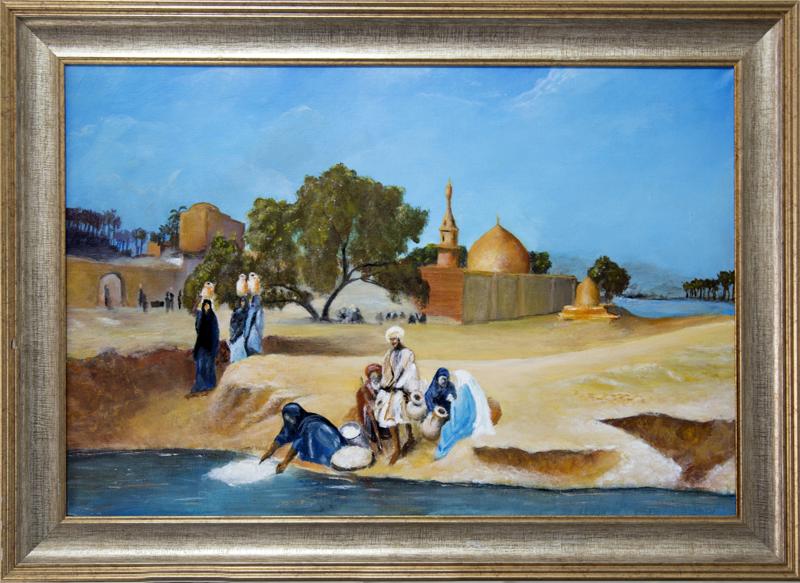 In this evocative scene inspired by an old Egyptian photograph, Maher Khrais masterfully revives a moment from the past, depicting daily life along the riverbank with warmth and authenticity. The composition captures men and women gathering water near a serene landscape of domed architecture, palm trees, and sunlit sand — a timeless vision of rural Egypt.