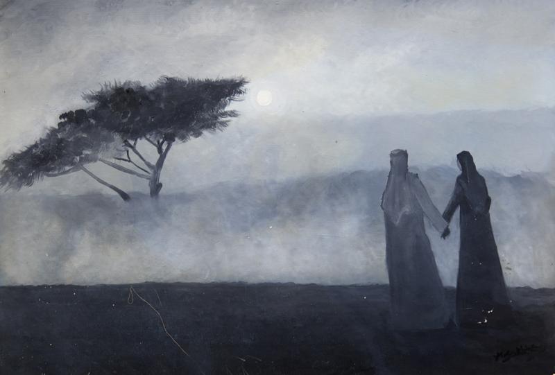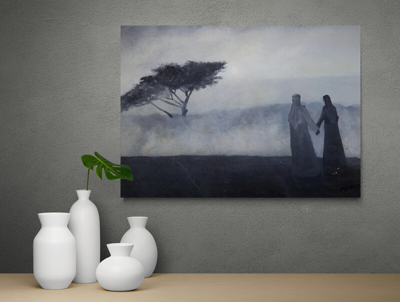 Maher Khrais paints a scene of quiet intimacy and transcendence — two figures stand hand in hand beneath a veiled sun, their silhouettes softened by the gentle haze of morning light. The landscape, rendered in muted shades of silver, blue, and grey, dissolves into atmosphere, allowing emotion to take precedence over form. The solitary tree, leaning slightly toward the figures, becomes a silent witness to love, memory, and belonging. The artist’s minimalist palette enhances the poetic stillness of the desert, transforming its vastness into a meditative space where presence and absence, distance and closeness, coexist. This painting reflects Khrais’s ongoing exploration of mood and identity within the context of the Arabian landscape — a union of nature and soul.
