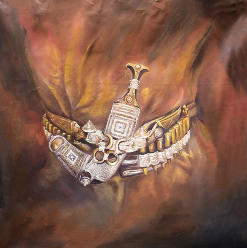 In “The Dagger of Honor,” Maher immortalizes one of the most powerful emblems of Arab heritage — the traditional khanjar or ceremonial dagger. Worn proudly at the waist, it stands as a symbol of dignity, courage, and ancestral pride. The artist captures not only the intricate craftsmanship of silver and gold but also the aura of legacy that surrounds it.