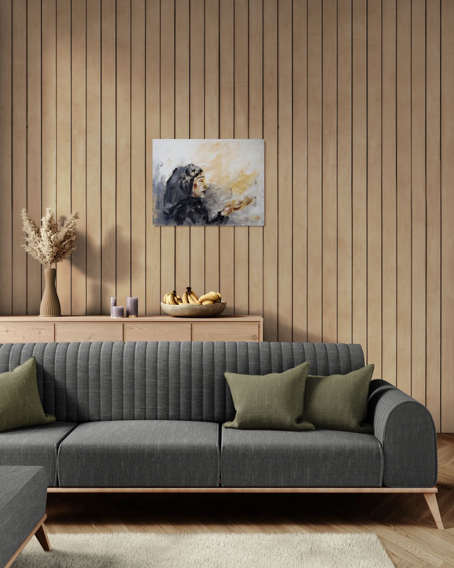 A moment of still devotion captured in layered tones of ochre, ivory, and charcoal. The woman’s lifted hand and closed eyes evoke both solitude and surrender — a whisper between earth and heaven. Through textured strokes, the artist transforms quiet faith into visible form, where light and shadow merge in reverence.